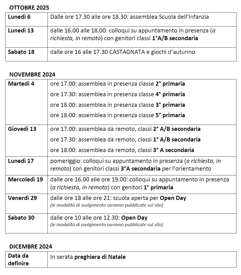 Calendario appuntamenti ottobre-dicembre 2025